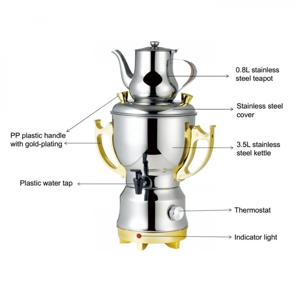 سعة الغلاية: 3.5 لترسعة إبريق الشاي: 0.8 لترالمادة: الفولاذ المقاوم للصدأ #202 مع درجة حرارة عالية الجودةصنبور بلاستيكي عالي الجودة للاستخدام المريحمع...
